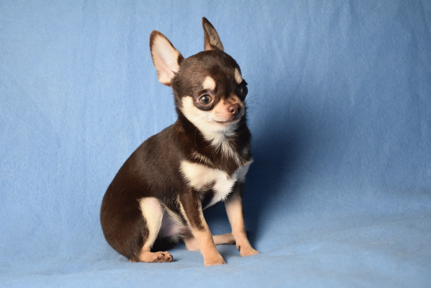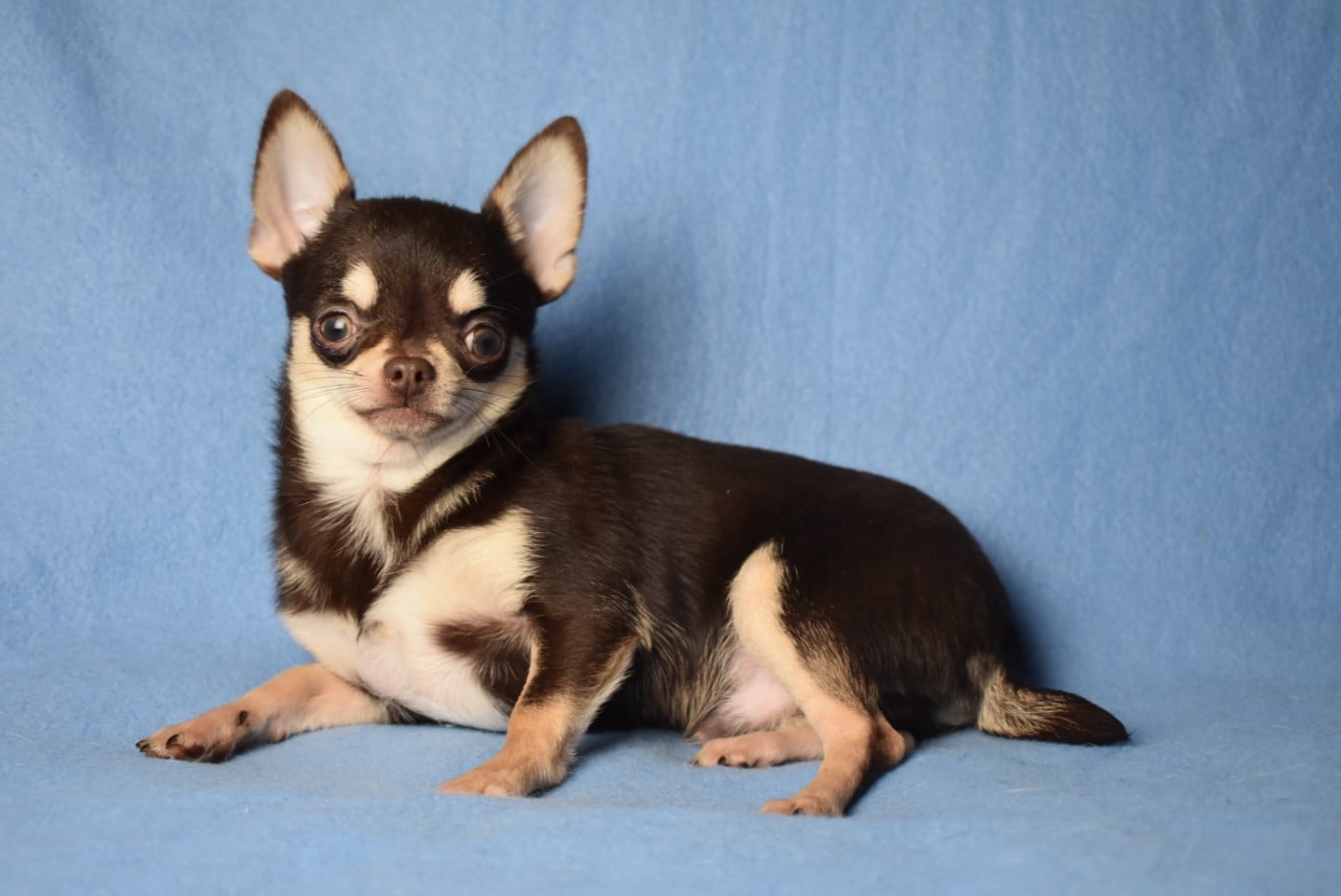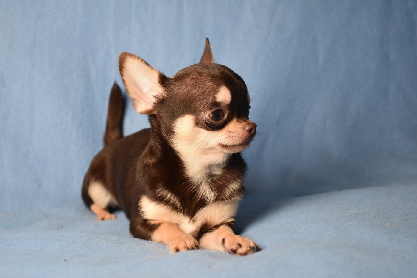 Mâle chocolat et tan à poil court, de petit gabarit. Ses testicules sont en place et sa dentition correct en ciseaux. Angel pèse 1kg100 à 6 mois.